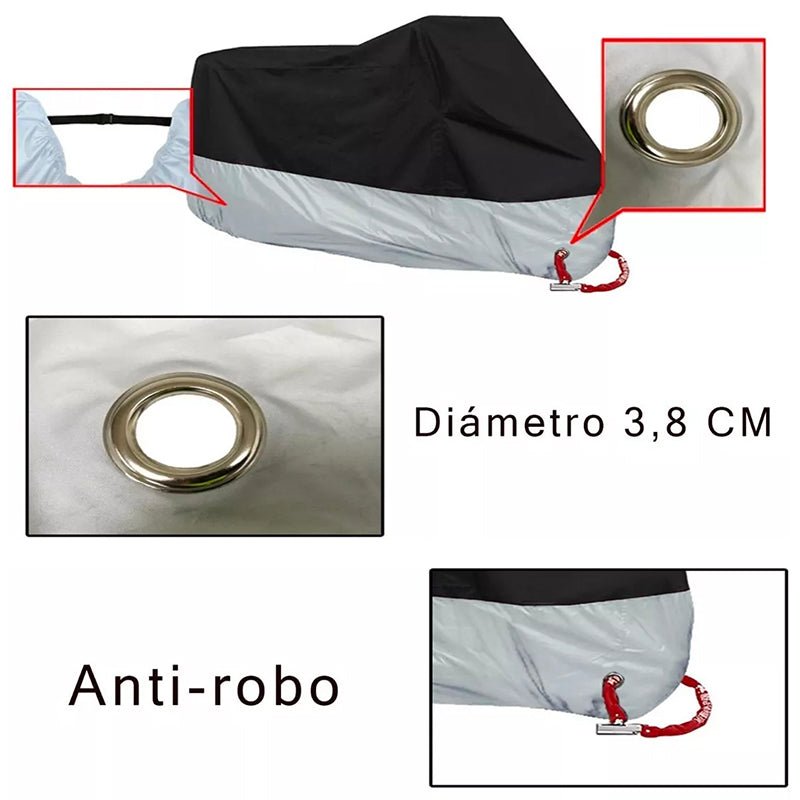 3. Resistente a los rayos UV: El material de la funda está diseñado para resistir la radiación ultravioleta del sol. Esto protege la pintura y los materiales de la motocicleta del deterioro causado por la exposición prolongada al sol.