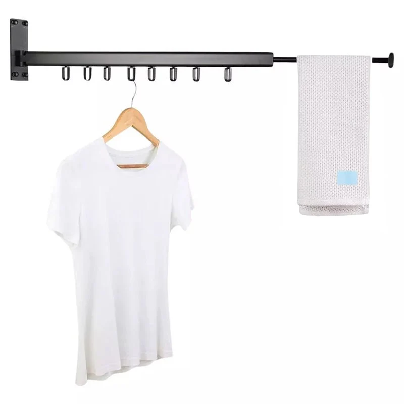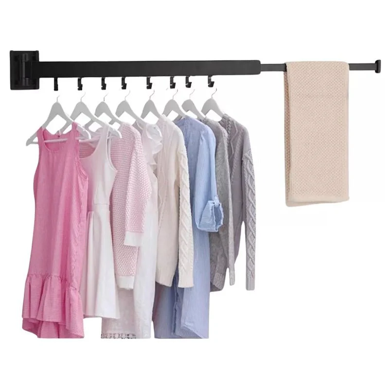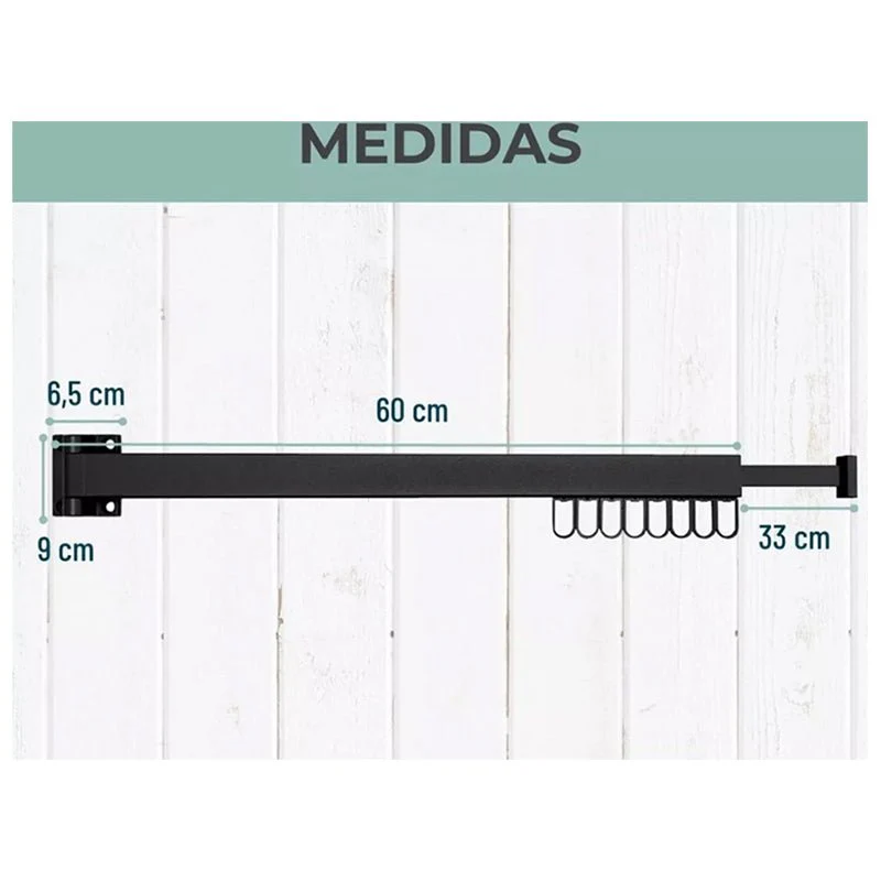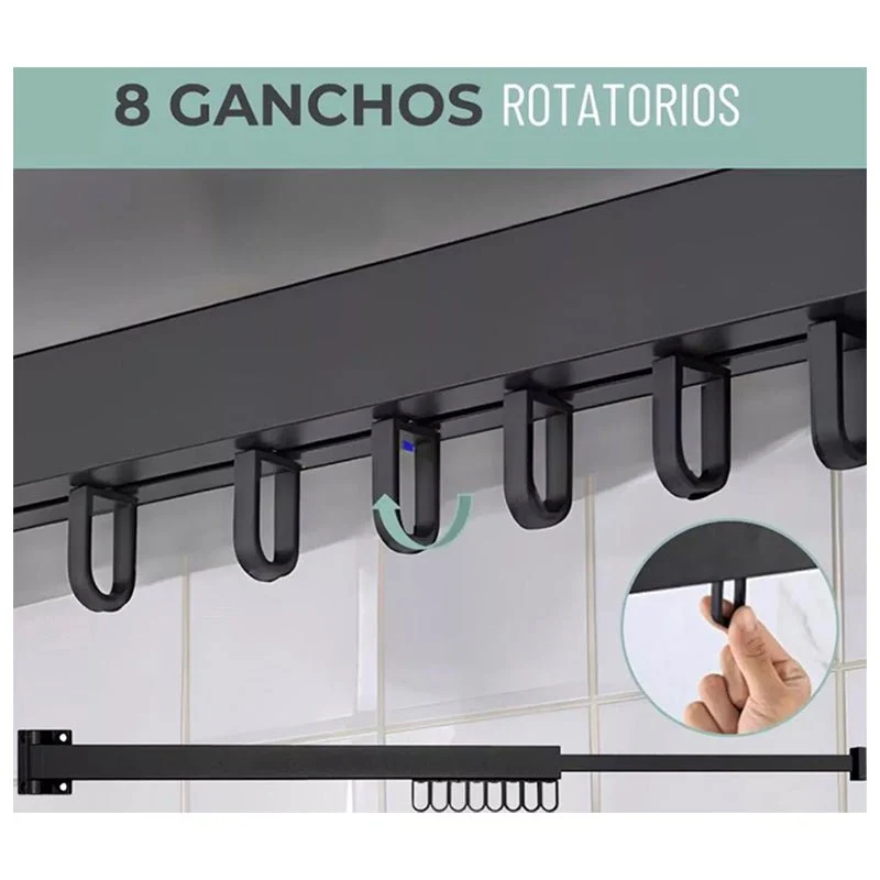 Maximiza el espacio y organiza tu ropa con este tendedero retráctil de pared de 60 cm + 33 cm extra y todo en color negro, diseñado para colgar prendas de manera eficiente y ordenada. Este práctico tendedero cuenta con 8 ganchos individuales, ideales para colgar camisetas, toallas, y otros artículos de manera compacta y accesible.