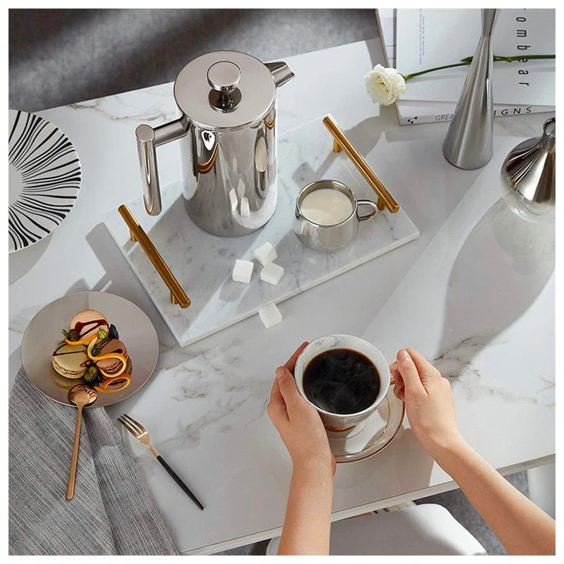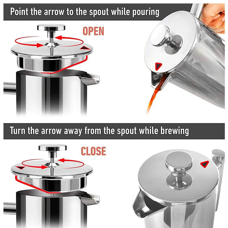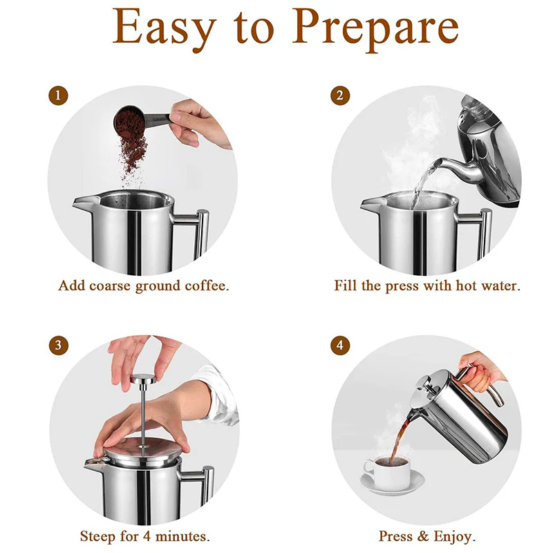 La cafetera prensa francesa de 800 ml de acero inoxidable es un elegante y funcional dispositivo diseñado para preparar café de alta calidad en la comodidad de tu hogar u oficina. Su diseño clásico y robusto combina una jarra resistente al calor con un marco y una prensa de acero inoxidable duradero.