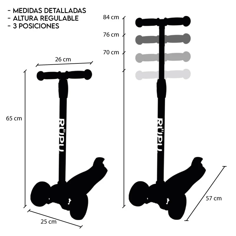 - Dimensiones: Base para los pies de 32 cm de largo x 13 cm de ancho en el centro, 10 cm al inicio y final. Largo total del scooter de 57 cm.